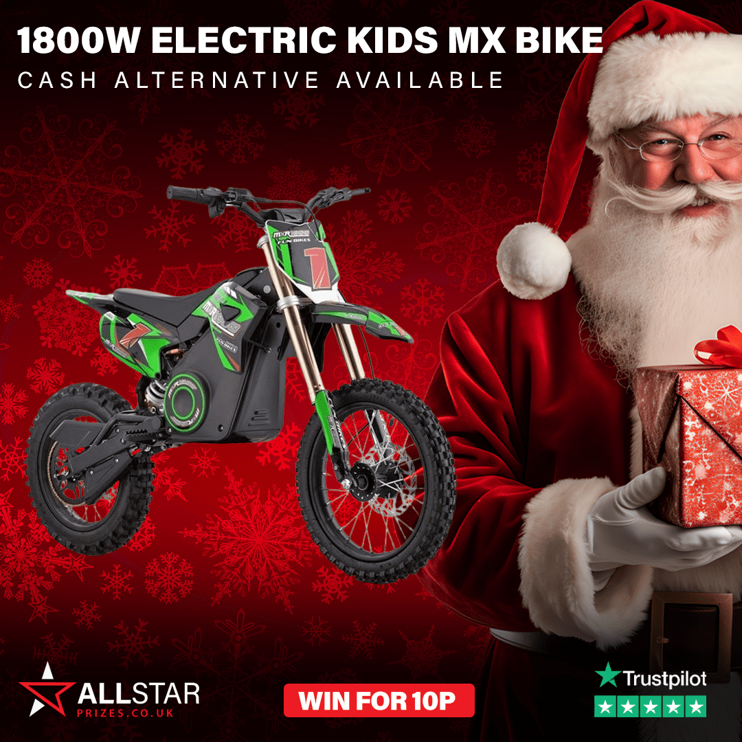 Fancy conquering trails and turning heads? For just 10p, you could win the Funbikes MXR 1800W 48V Lithium Electric Dirt Bike — a powerful, stylish ride perfect for young adventurers. This bike packs serious punch with a strong 1800 W motor and 48 V lithium battery, giving future riders a thrilling off-road experience with speed, agility, and the freedom of electric power.